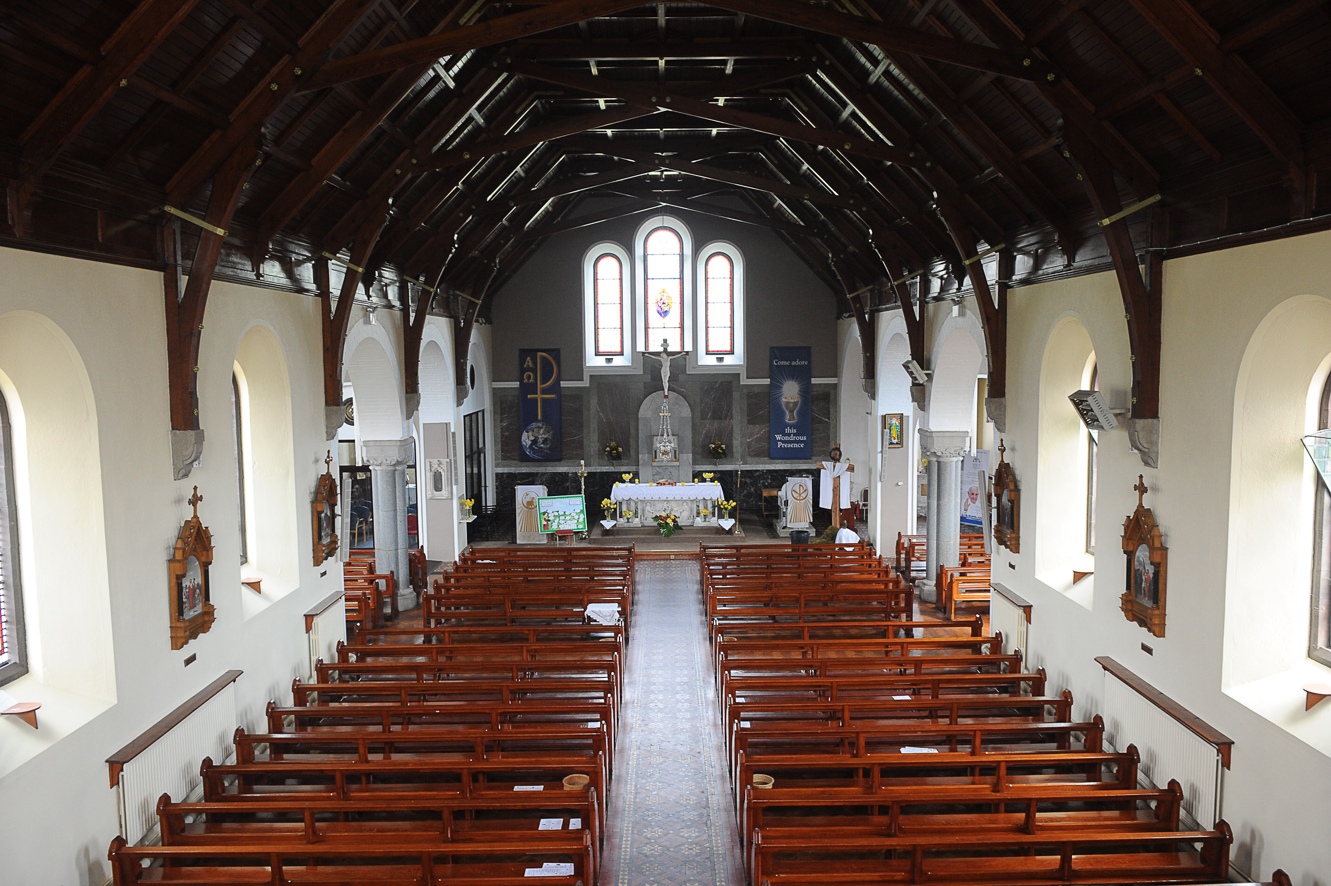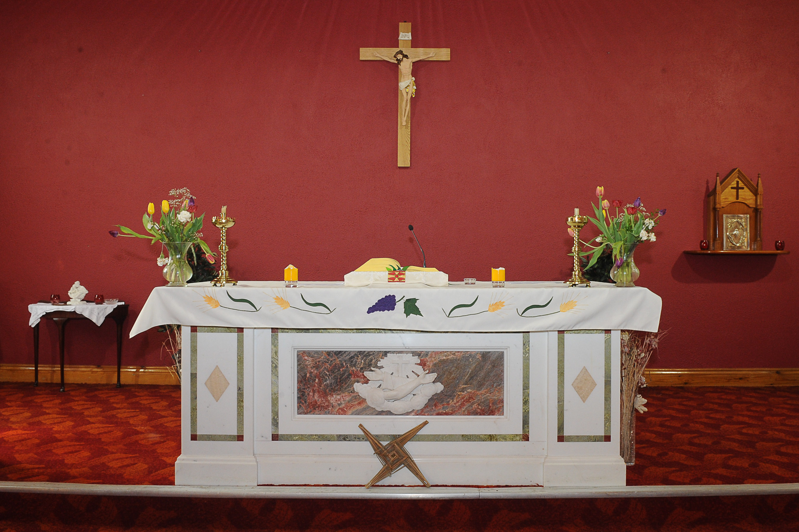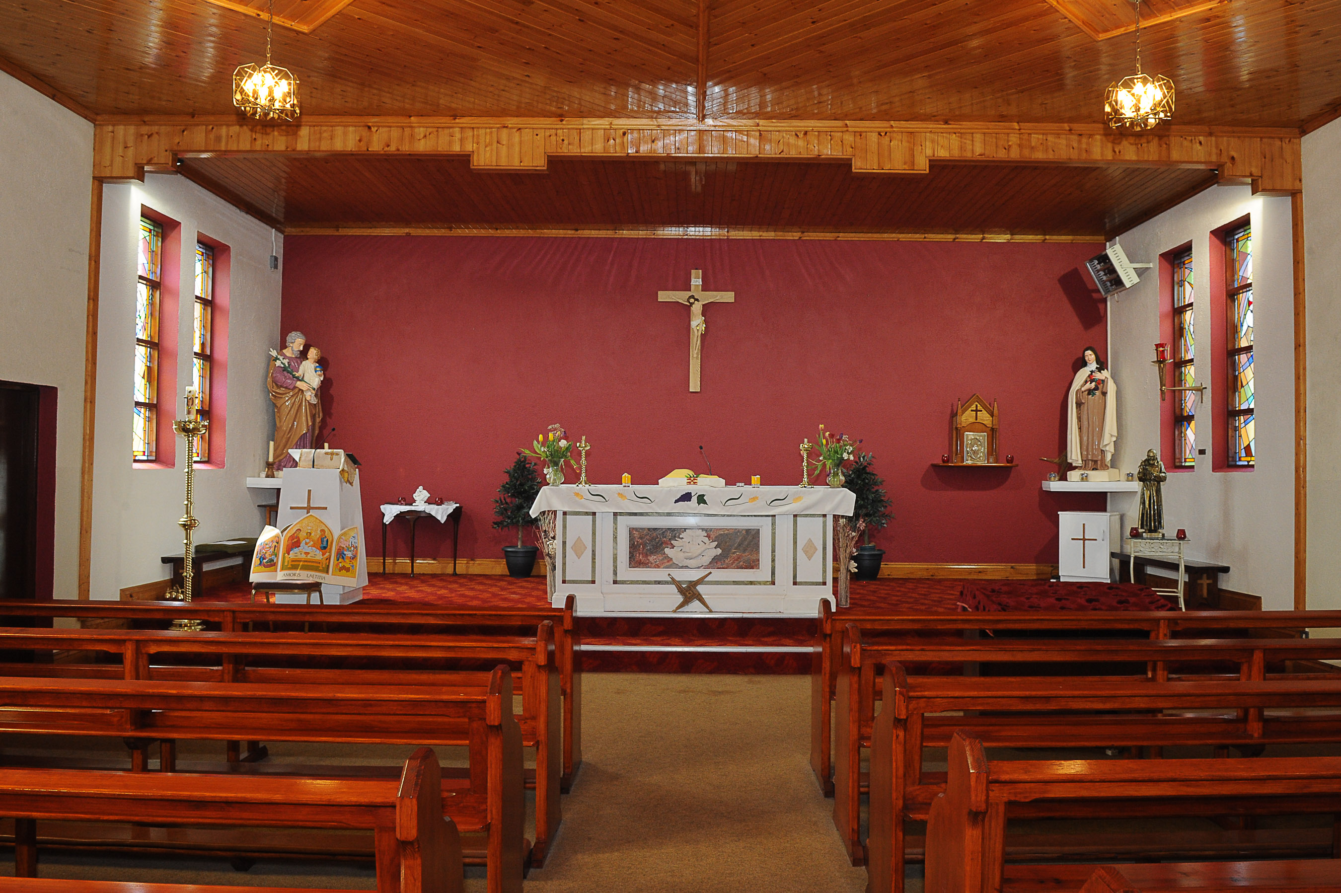Sanctuary view of Leitir Bric church with staues of St. Joseph to the left and the Little Flower to the right.