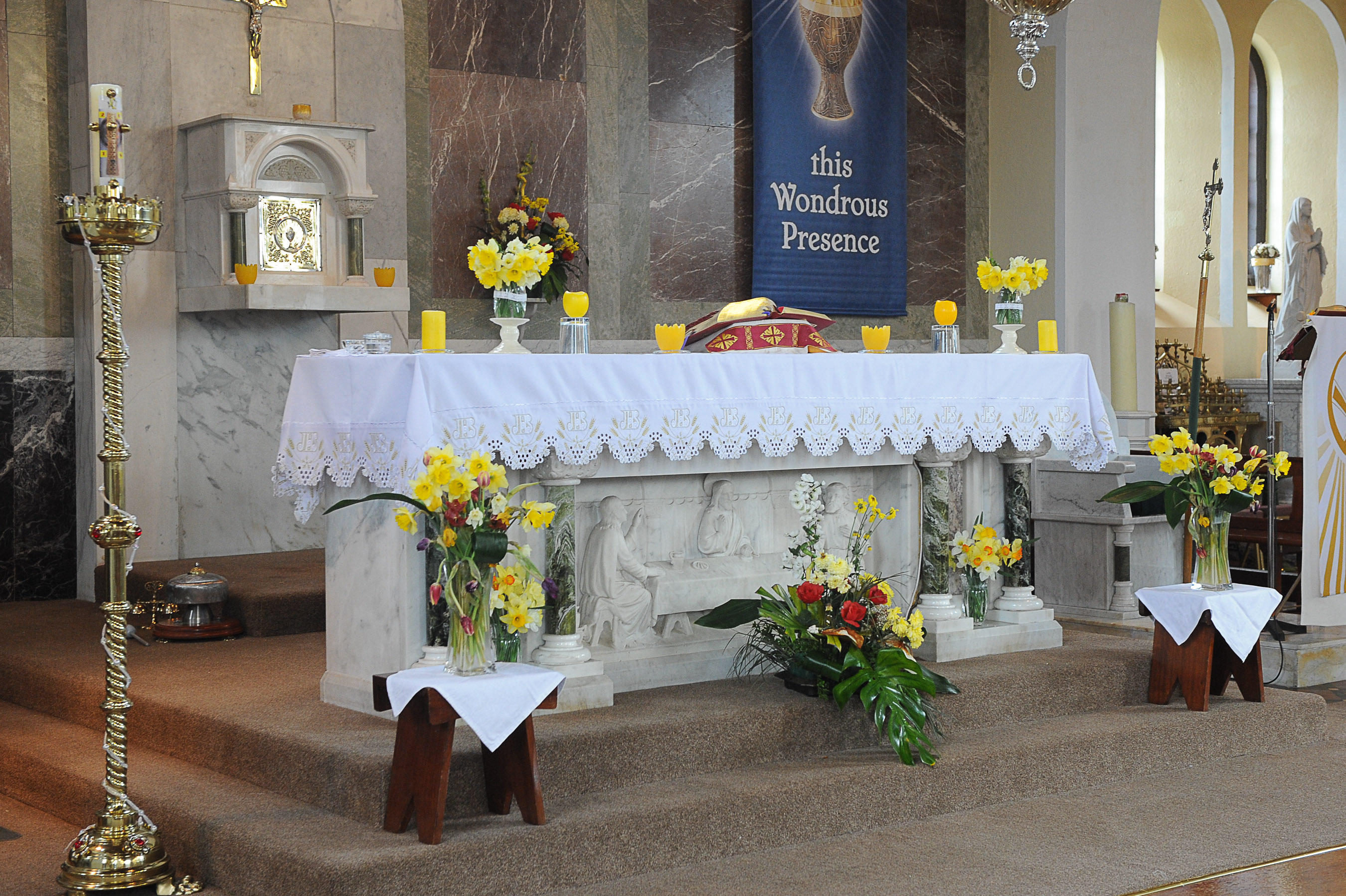 Main Altar of White Carara Marble and carved frontal of the Road to Emmaus gospel story.