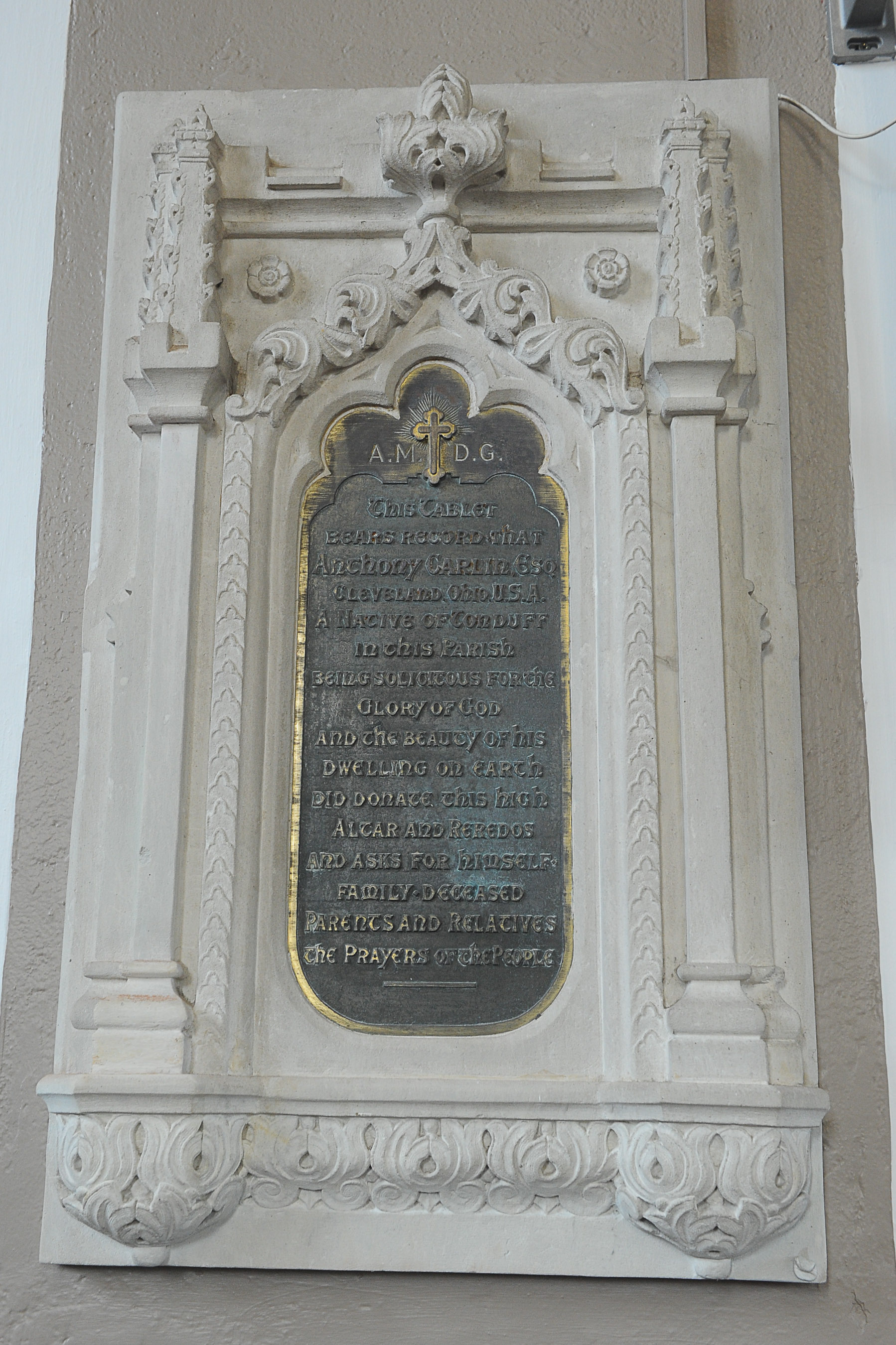 Plaque honouring Anthony Carlin, Tonduff & Ohio donor of Altar and Reredos, Glenfin church.