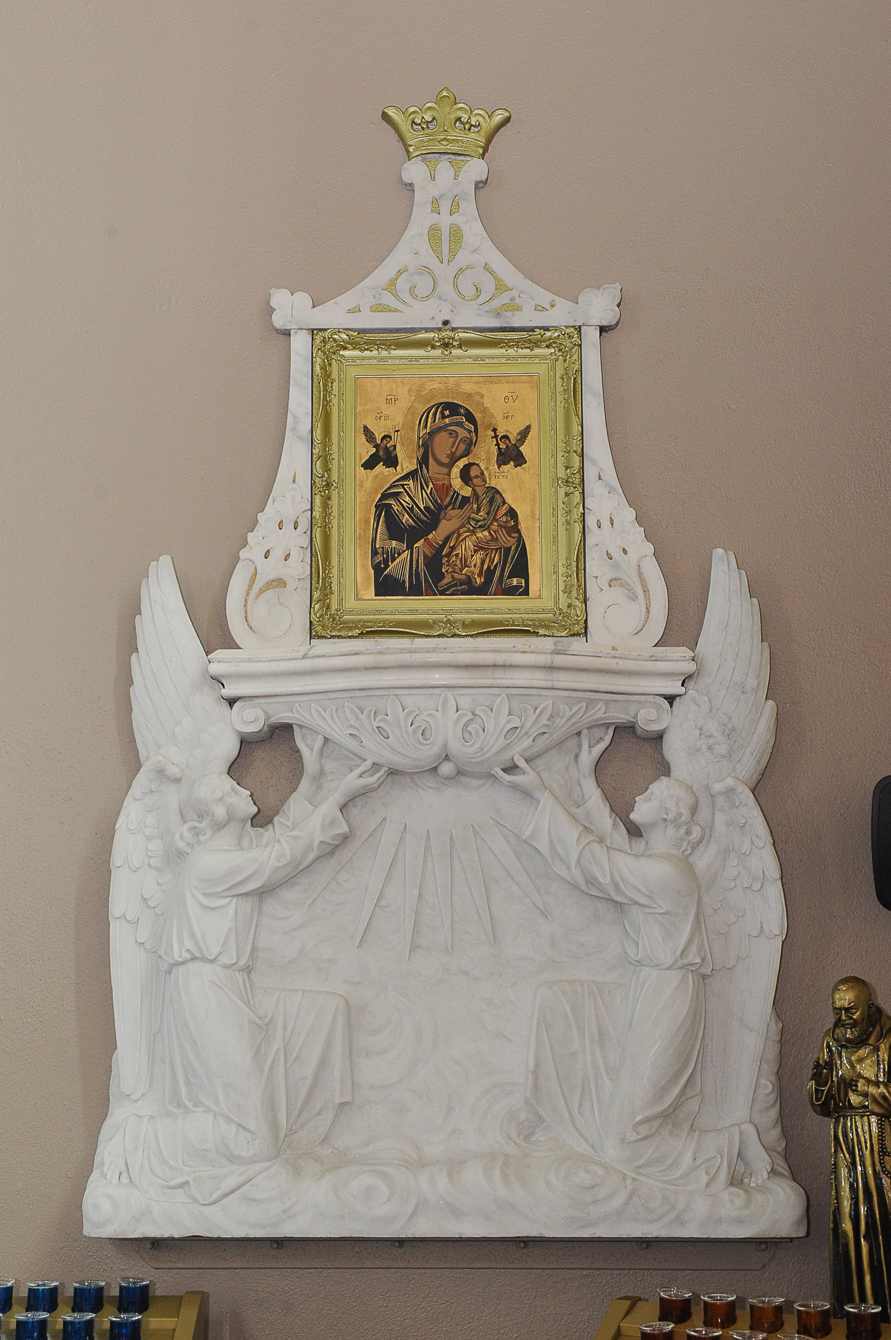 Image of Our Lady of Perpetual Succour surrounded by white Carara Marble angels.